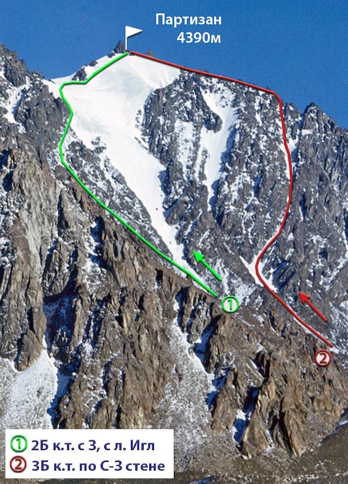 Спуск по маршруту второй категории через ледник Партизан. Все восхождение занимает 11 – 12 часов. Маршрут по северо-западной стене проложен впервые 12 сентября 1945 года инструкторами школы горной под готовки П. Семеновым и Г. Щур.